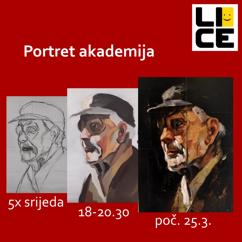 Portret akademija s majstoricom portreta Dijanom Lukić, srijeda 25.3. 18-20.30; ovaj edukativni progam osmišljen je kao postupak studija portreta na akademski način, prema modelu, počevši od crtanja, do slike – ulje na platnu. Cijeli proces trajat će pet tjedana. Vodimo vas kroz temeljne i napredne tehnike portretne umjetnosti, od inicijalnog crteža do završnog ulja na platnu. Susrest ćemo se s pojmovima proporcija, anatomije i volumena u prostoru, proučit ćemo svjetlo i sjenu kao prethodnicu slikarstva; slikanje u slojevima i gradaciju tonova; do finalizacije i “karaktera”.