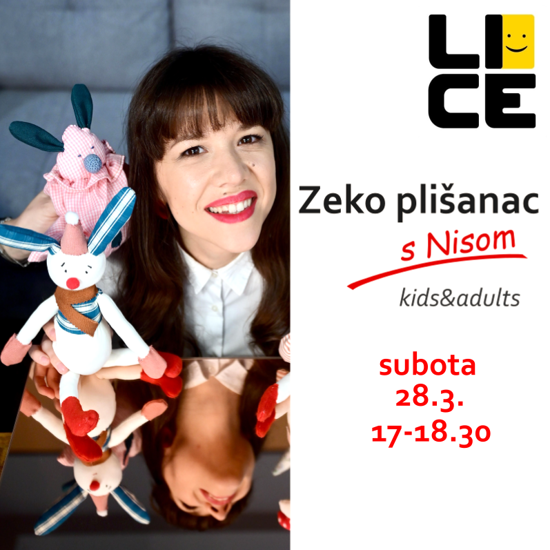 Zeko plišanac, subota 28.3.. 17-18.30; zabavna radionica izrade plišane igračke; za djecu 8+ i odrasle; igrajući se različitim materijalima stvaramo igračke i udahnjujemo im dušu. Nije potrebno predznanje. Broj mjesta ograničen. Cijena od 25 eura za odrasle i 20 eura za djecu uključuje sve materijale i malu konzumaciju (sokovi i keksi)