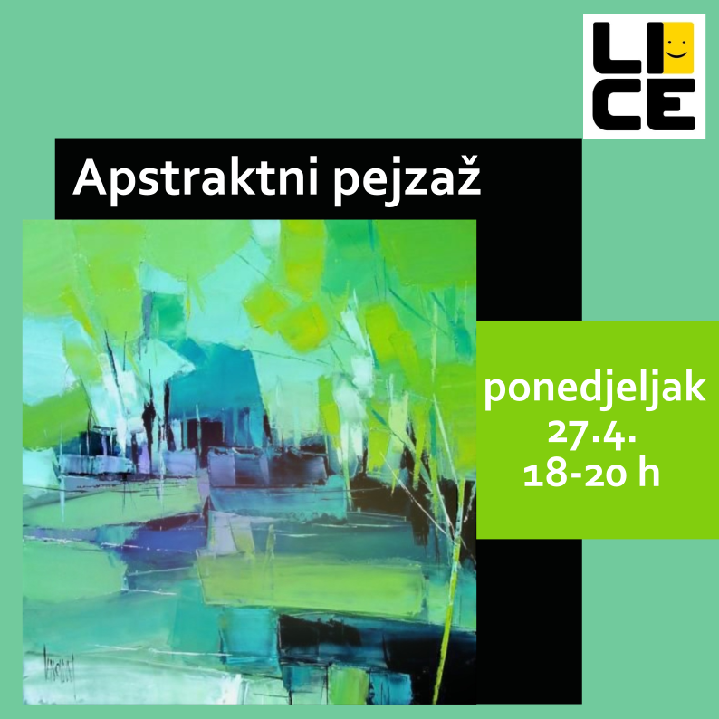 Apstraktni pejzaž, 27.4. 18-20 h; radionica nas vodi kroz proces slikanja pejzaža koji se sastoji od poteza boje, mrlja, linija i apstraktnih oblika koji kao cjelina funkcioniraju kao prikaz prirode. Ovo je granična forma gdje ne znamo je li pejzaž apstrahiran ili apstrakcija dobiva obilježja pejzaža. Nije ni važno. Važno je da se opustimo u igri bojama, zabavimo i stvorimo vlastitu kreaciju. Predznanje nije potrebno, kao ni poseban talent.