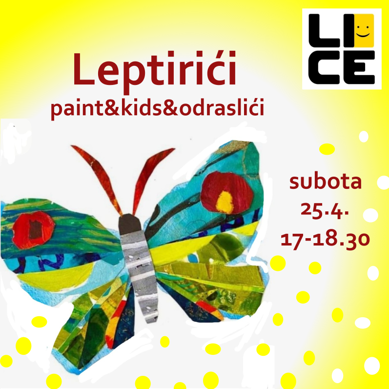 Leptirići, paint&kids&odraslići, 25.4. 17-18.30; draga djeco, na subotnju radionicu povedite svoje odrasliće da zajedno s vama stvaraju divne slike na platnu. Svatko bira svoj motiv i nema prepisivanja. Tema su leptirići, a u njih se razumije svako dijete. Stoga, zabavimo se i stvarajmo zajedno!