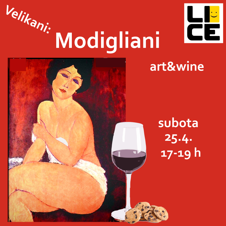 Modigliani, art&wine, subota 25.4., termin 17-19 h. Upoznajmo jednog od velikana slikarstva 20 st. poznatom po svojim putenim ženskim aktovima i portretima ljepotica dugog vrata. Izaberimo svoj omiljeni motiv i slikajmo inspirirani ovim strastvenim ljubiteljem ženske ljepote. Uz čašu vina i odlično vodstvo naše učiteljice Tare provedite ugodna i zabavna dva sata, a ponešto ćete i naučiti.