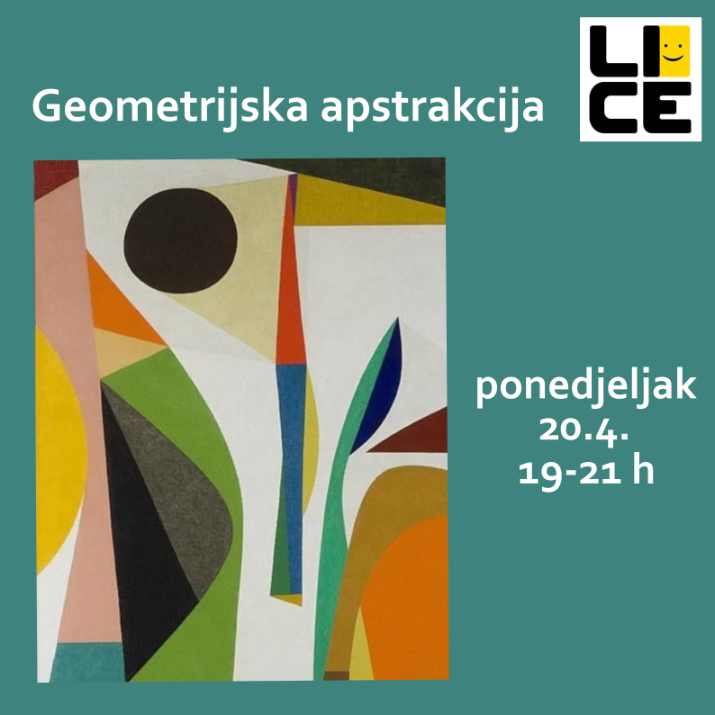 Geometrijska apstrakcija, 20.4., 18-20 h, Zagrebačka 23. Opustimo se u igri apstraktnim oblicima i čistim bojama na način geometrizacije kako su to raditi velikani poput Kandinskog, Mondriana, Kleea. Zabavimo se kombinacijama boja i oblika koje čine nove realnosti na 2D plohi. Otkrijmo koliko kreacija može biti zanimljiva. Prethodno iskustvo nije potrebno. Broj mjesta ograničen.
